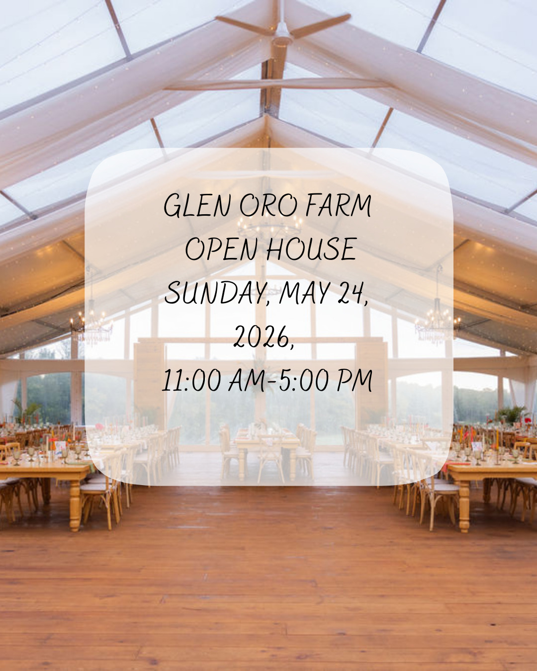 Join us on Sunday, May 24th from 11:00 AM – 5:00 PM for the Glen Oro Farm Open House. Tour our beautiful ceremony, cocktail, and reception spaces while experiencing the charm of our countryside venue. Meet our event coordinator and connect with talented local vendors who can help bring your wedding or special event to life. Complimentary tea and coffee will be available as you explore and get inspired for your big day.