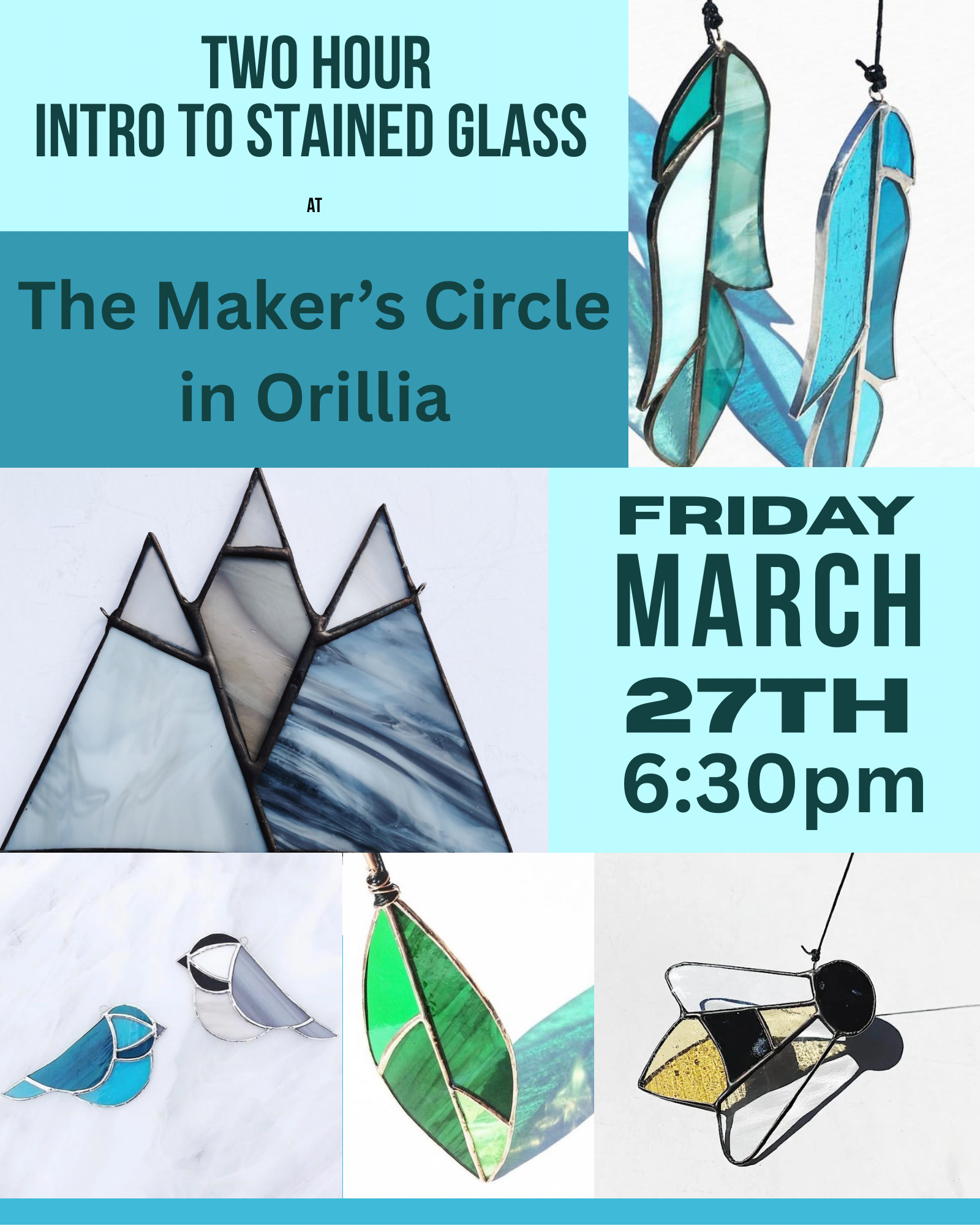 Please join Jess from Flux Glass Co for this fun intro to stained glass. Using glass pieces, precut and ground by Jess, make your choice of feather, blue jay, cardinal, bluebird, chickadee, green leaf, sun rays, mountains, sunflower, coneflower, bee, oak leaf, or mushroom.